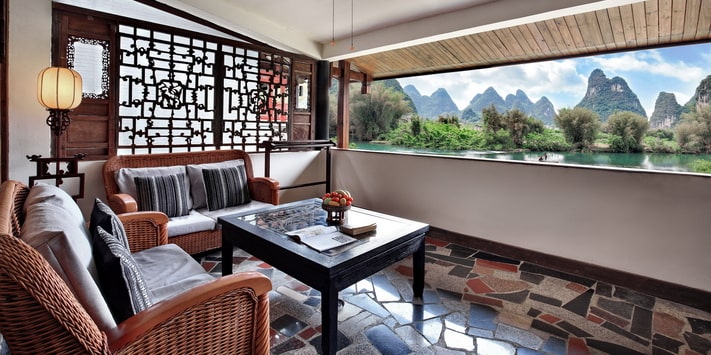 This bright, sunny room features two queen beds, a traditional sofa which sleeps an addtional person, a private bath and oversize balcony with spectacular views of the Yulong River and mountains. You will not find a better value in Yangshuo!